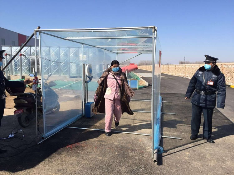 2、翱翔科技有限公司防疫嚴密,利用公司產品設立防疫消毒通道,保安員負責測量人員體溫、登記,監(jiān)督人員在防疫通道消毒后進入廠區(qū)。