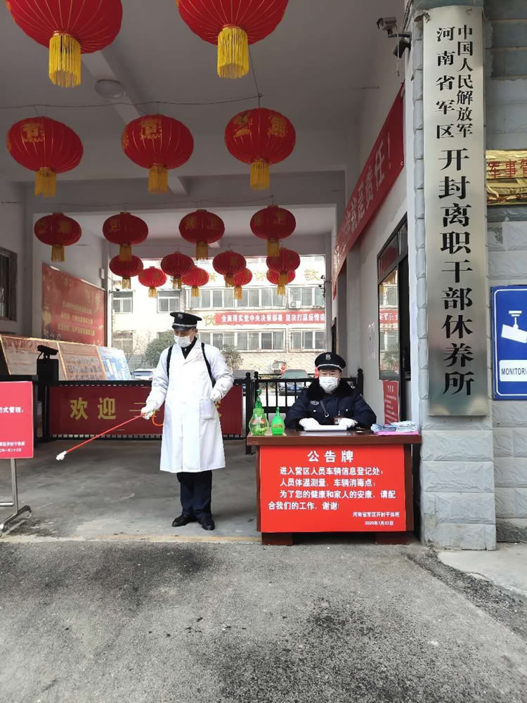 5、河南省軍區(qū)開封離職干部休養(yǎng)所崗點的保安員盡職盡責。接到防疫任務后,保安員實行全封閉管理,隊員24小時堅守崗位,嚴格控制進出人員,承擔著出入人員體溫測量、車輛消毒、軍干所場所的消毒任務,并做好登記工作。